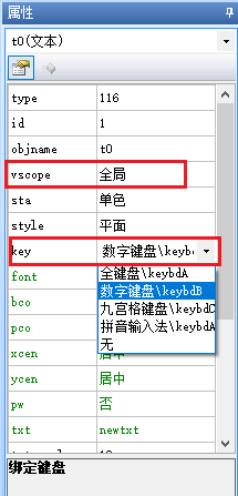 以下图为例,首先我们将控件的vscope属性设置为全局,然后配置key属性,选择你需要的键盘即可,会自动导入键盘需要的资源